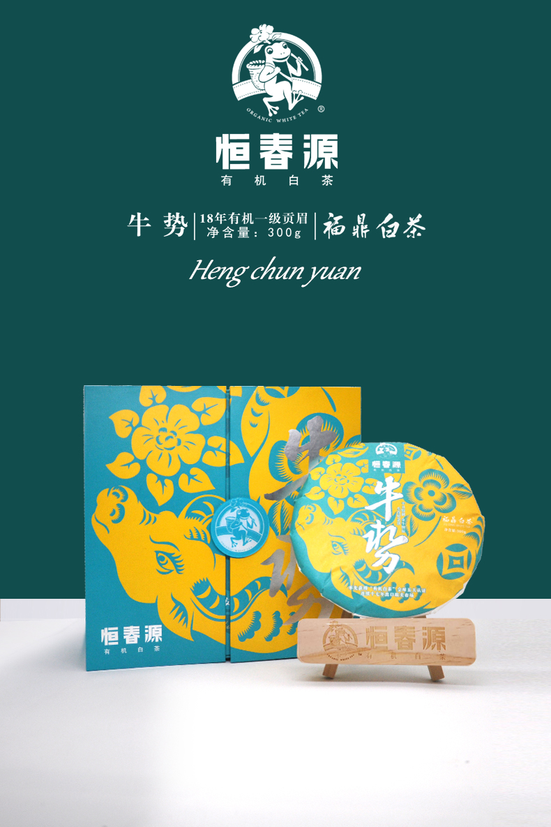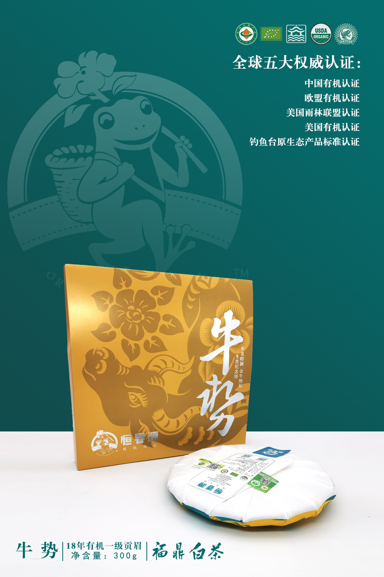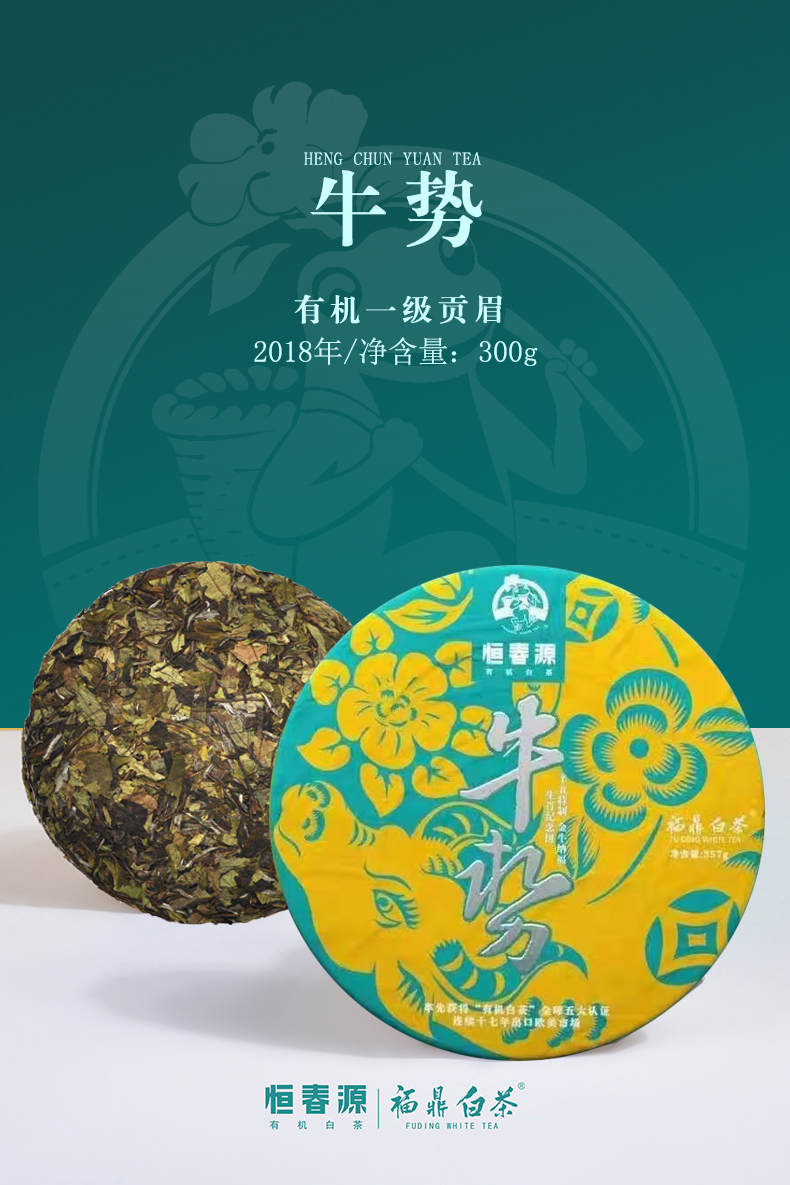 牛勢(緊壓白茶) 零售價:1060元/餅 5300元/提 年份:2018年 等級:有機一級貢眉 凈含量:300克/餅 1500克/提 裝箱量:10餅/件(5餅/提)