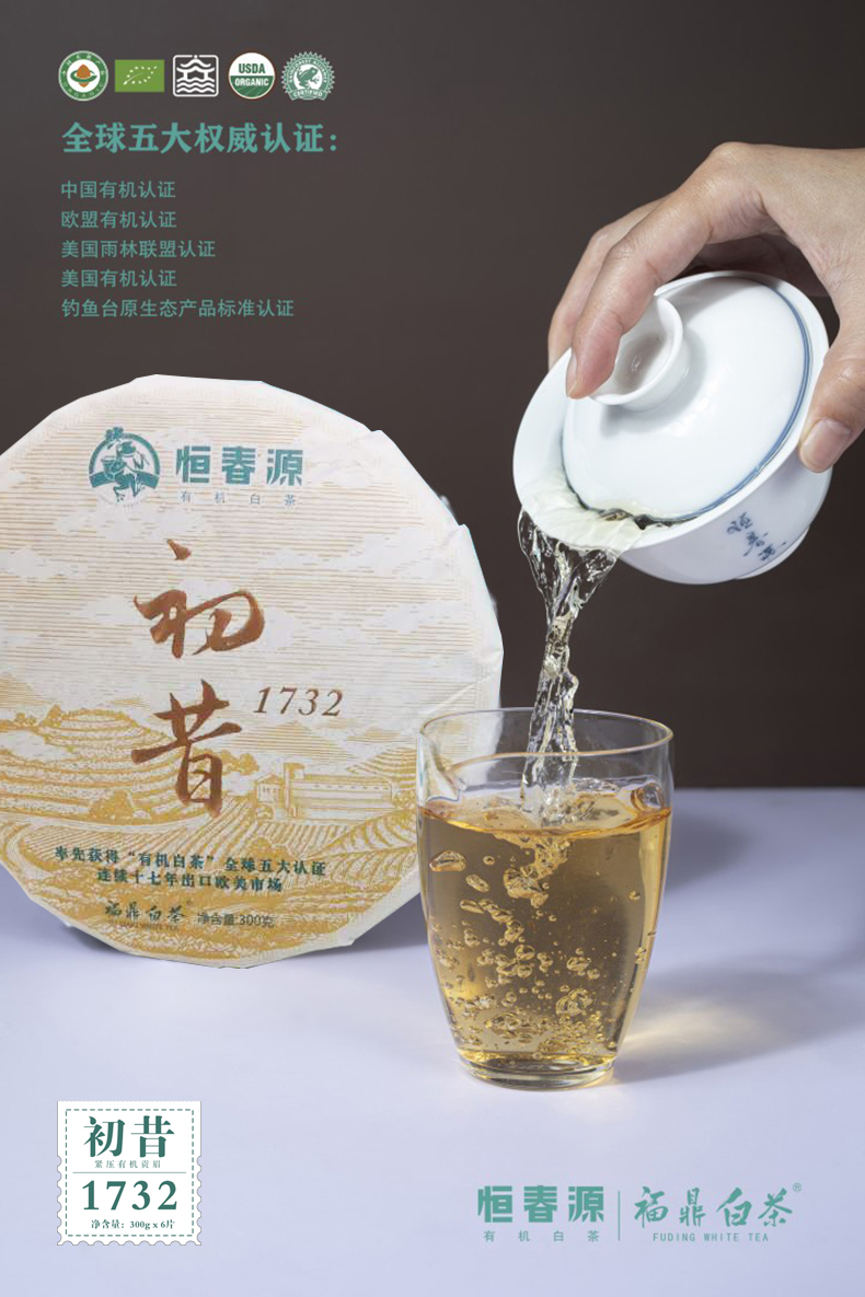 產(chǎn)品名稱:初昔1732(緊壓白茶) 全國統(tǒng)一零售價:1260元/餅 配 料:2017年有機一級貢眉 凈 含 量:300g 生產(chǎn)日期:見噴碼 保 質(zhì) 期:適宜長期保存,十五年之內(nèi)飲用最佳 貯存方法:密封、避光、防潮、防異味